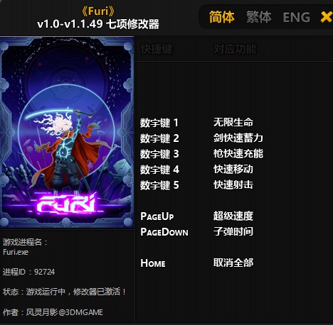 数字键 1 - 无限生命数字键 2 - 剑快速蓄力数字键 3 - 枪快速充能数字键 4 - 快速移动数字键 5 - 快速射击PageUp - 超级速度PageDown - 子弹时间Home - 取消全部注意事项:1. “剑快速蓄力”、“枪快速充能”、“快速移动”这三个功能激活后即使再取消,在本次战斗中也会一直生效,下次战斗才会真正取消。