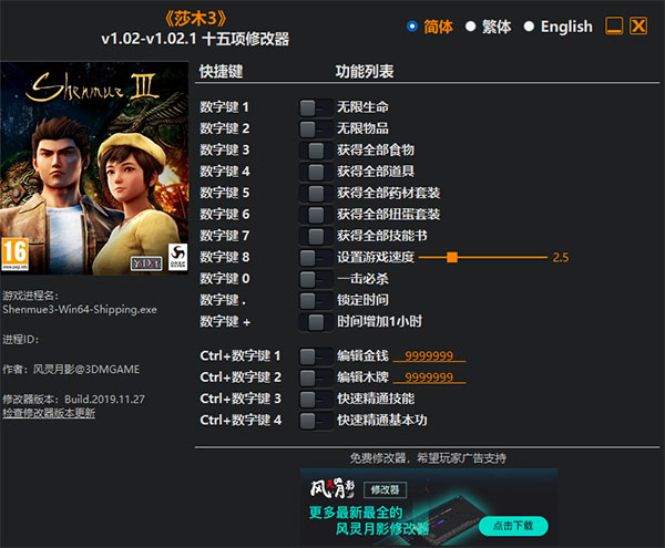 莎木3游戏修改器是专为SEGA制作发行的一款沙盒类动作冒险游戏《莎木3(Shenmue 3)》提供的游戏辅助工具,由风灵月影制作,界面为简体中文,功能直观明了。游戏剧情承接前作,远离家乡芭月凉在本作中会有什么样的遭遇呢,想降低游戏难度,快速体验剧情的玩家可以使用该软件快速获得无限生命、无限物品、一击必杀、锁定时间、编辑金钱、快速精通技能等强大的游戏属性,有效的降低了游戏的难度,更快的进行通关,非常的强大。