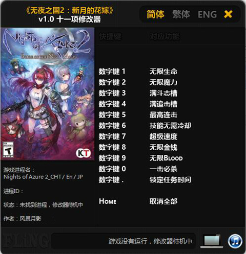 无夜之国2新月的花嫁修改器是专为大型主机pc游戏《无夜之国2新月的花嫁(Nights of Azure 2: Bride of the New Moon)》由风灵月影量身定制的一款绿色免费的游戏辅助修改工具软件。使用这款修改器不但能够为你带来无限生命、无限魔力、满斗志槽、超级速度、无限金钱和一击必杀等以下十一项功能,进入游戏后通过指定热键即可快速开启,简单快捷高效,降低游戏难度,帮助玩家轻松解决战斗,从而让你获得更佳的用户体验。但为避免游戏乐趣的遗失,请大家适度进行修改!1