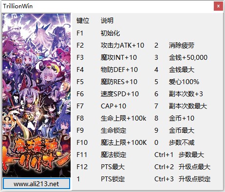F1 初始化F2 攻击力ATK+10F3 魔攻INT+10F4 物防DEF+10F5 魔防RES+10F6 速度SPD+10F7 CAP+10F8 生命上限+100kF9 生命锁定F10 魔法上限+100kF11 魔法锁定F12 PTS最大1 PTS锁定2 消除疲劳3 金钱+50,0004 金钱最大5 爱心+100%6 副本次数+37 副本次数最大8 金币+109 金币最大0 步数不减Ctrl+1 步数最大Ctrl+2 升级点最大Ctrl+3 升级点锁定使用说明