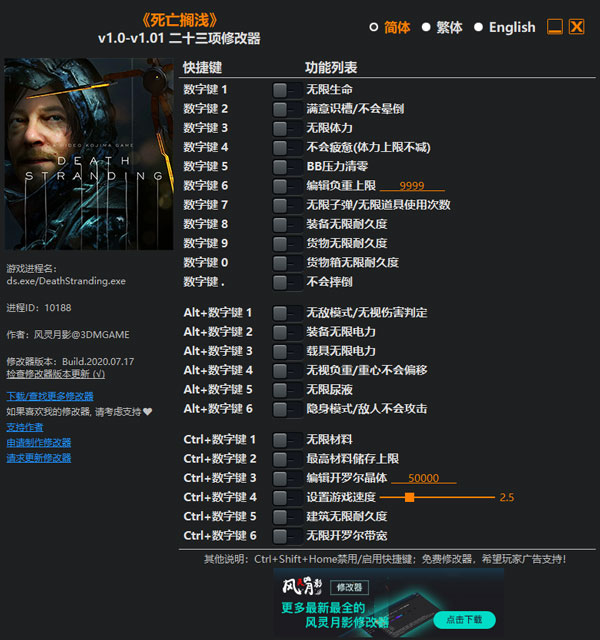 点击简体、繁体、English,可以切换语言(切换语言后修改器将把该语言设置为默认语言)按Ctrl+Shift+Home,可以关闭快捷键检测,避免误按快捷键以及与游戏按键重复的情况,再按一次则重新开启。死亡搁浅二十三项修改器功能