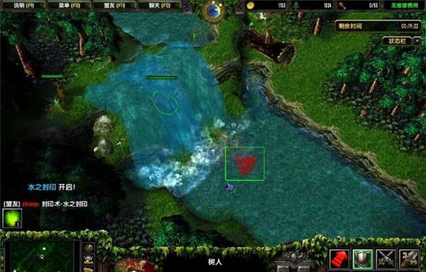 2、站到地图右中瀑布上面,输入“封印术-水之封印”。此时瀑布下面的路就封死了,树人炎魔都无法通行