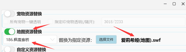 开启地图资源替换的按钮,在下拉框中选择或输入指定的地图后,再选择本地需要导入的文件。