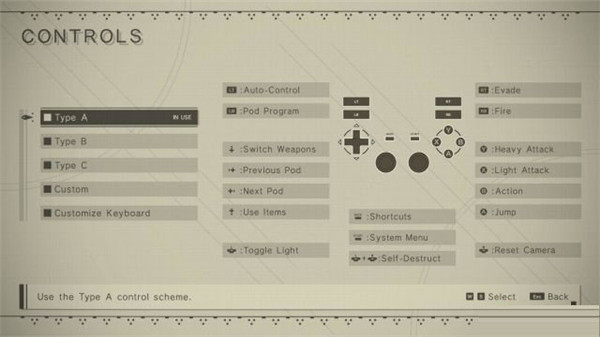 1、XBOXONE版基本键位LT键:自动控制;LB键:Pod程序;十字键↑:切换武器;十字键←:选择前一个Pod;十字键→:选择下一个Pod;十字键↓:使用道具;摁下左摇杆:切换电筒;back键:快捷栏;start键:系统菜单;摁下左摇杆+右摇杆:自毁;RT键:躲避;RB键:开枪;Y键:重击;X键:轻击;B键:行动;A键:跳跃;摁下右摇杆:重置镜头;