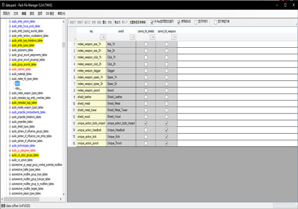 1、全面战争系列'Warscape .pack文件的查看和操作。2、支持ToB、WTH2、TWH、ATW、R2TW、STW、NTW、ETW和TW3K。3、集成db文件编辑器(《全面战争传奇:特洛伊》的部分文件还不支持)。4、集成model_buildings编辑器。5、集成.esf(startpos等)编辑器。Pack File Manager汉化版使用方法