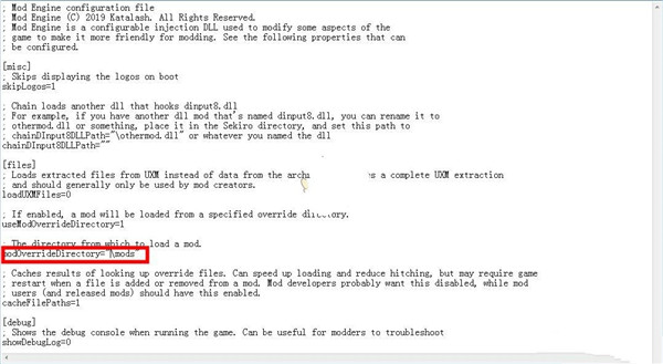 2、在游戏根目录新建一个“mods”文件夹,并将你想安装的MOD文件放入这个文件夹;说明:你可以通过编辑modengine.ini文件中的 modOverrideDirectory="/mods"内容进行自定义,保持一致即可。3、打开modengine.ini文件,将其中的“modOverrideDirectory="mods"”这一条修改为你的文件路径(例:steamsteamappscommonSekiromods),如果MOD无法正常生效可以不修改这一条直接启动游戏使用MOD。