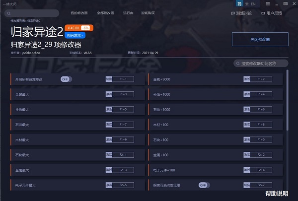 归家异途2是一款可玩性极高的rogue-like游戏,在游戏当中凭借其精美细腻的游戏画质,趣味横生的游戏玩法,揽获了不少小伙伴的喜爱。但由于许多朋友抱怨在游戏中资源太过匮乏,角色经常死亡,为了帮助小伙伴解决此类问题,小编带来了归家异途2游戏数据修改器,该修改器为一修大师版,版本中支持玩家自由修改多达二十九项游戏数据,如开启所有资源修改、金币最大、补给最大、石油最大、超级速度、无人机无冷却、无限伤害、人物无敌等等修改功能,玩家都可通过简单易上手的操作进行使用。并且此修改器类别于其他修改器而言,无任何内置广告、无毒无害、体积小巧,能真心实意的为玩家带来游戏的独特乐趣所在,对此你心动了吗?快来下载进行体验吧!
