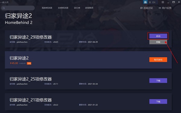 3、进入后,你可以看到归家异途2的其他修改器,在这里我们只需选择上面的“归家异途2_29项修改器”即可,点击“启动”。