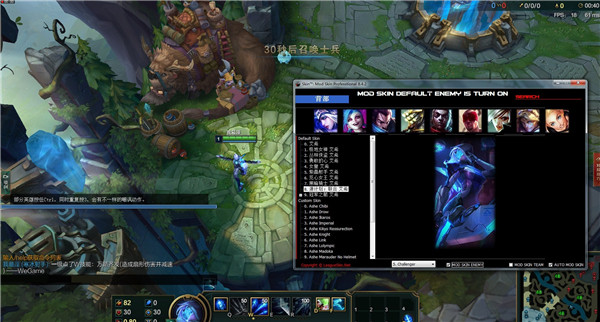 主界面下面一栏(从左到右)中间那个选择框是修改段位框的从上到下依次是:1、f_--关闭2、Gold-_-黄金3、Platinum---铂金4、Diamond---钻石5、Master---大师6、Challenger---王者2、MOD SKIN DEFAULTENEMY---把你敌人的皮肤改成默认皮肤3、MOD SKIN TEAM---修改所有人的皮肤4、AUTO MOD SKIN---自动更换皮肤5、右上角红字SEARCH---搜索(在后面的红线上填入英雄名字)6、(点一个英雄头像后)左下角蓝字-ACTIVE SKIN HERE--应用皮肤7、(点一个英雄头像后)左上角“背部--其实是返回。