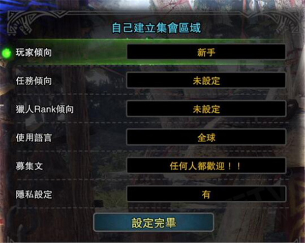 其中前面4个选项与第一项选择中的条件相同,用于筛选进入的队友;募集文一般用于描述房间的具体用处(如:连续刷蛮鄂龙,来HR4以上的);而隐私设定则会让自己的集会所无法被其他外来路人搜索到,用于与好友联机。或者是不想被人打扰的单机玩家。方法三:加入别人的集会所