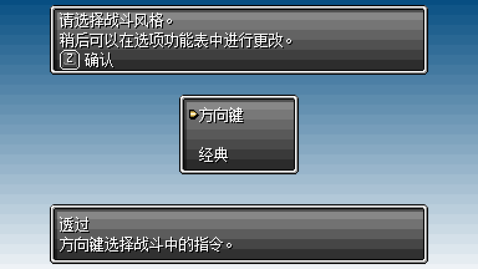 1、游戏开始可以选择战斗风格,“方向键”可以理解为快捷键,类似上下左右分别代表普攻,技能,道具,更多等等,而“经典”就是正常的回合制战斗,通过上下左右选择相应选项,再加上“确定,取消”操作。