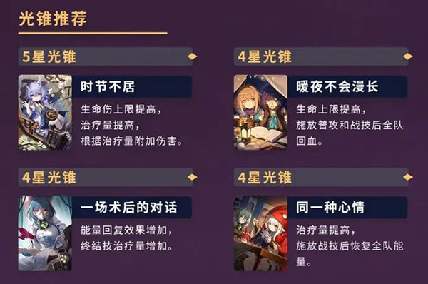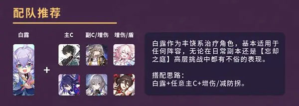 白露作为丰饶系治疗角色,基本适用于任何阵容,无论在日常副本还是忘却之庭高层挑战中都有不俗的表现。搭配思路:白露+任意主C+增伤/减防拐。