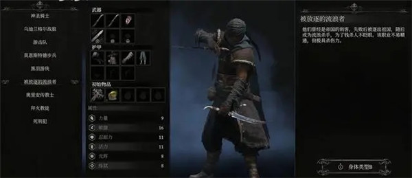 被放逐的追猎者力量过低。完全不加力量的话,很有可能只能使用冲击力和削韧不够的弱势小型武器,如果要咯微补一点力量的话也可以选黑羽游侠开局,黑羽游侠多2点力量开局,成型晚2及,但物理路线力量不完全是废点。