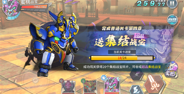 强悍无比的集结战宝!完成任务——通过普通关卡第四章兑换。狂暴连击、爆炸高伤,超品战宝不可错过!