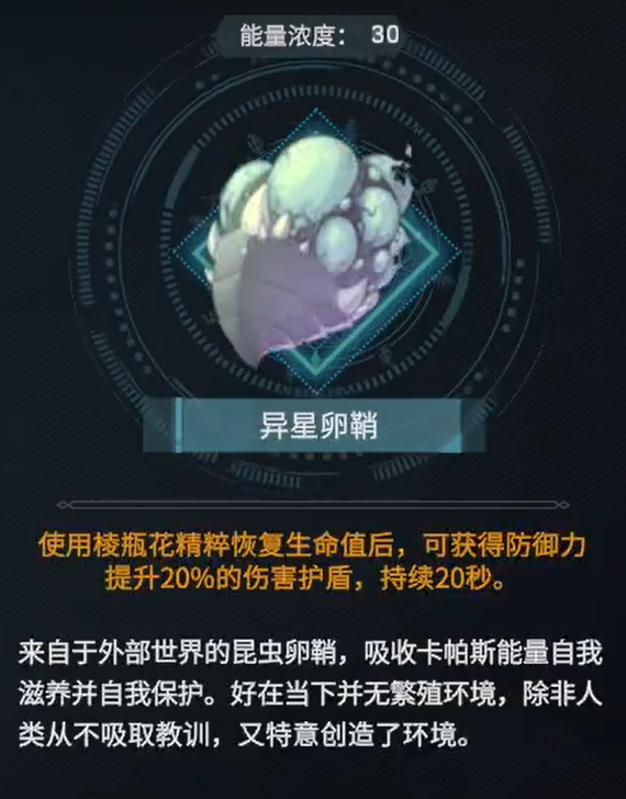 使用棱瓶花精粹恢复生命值后,可获得防御力提升20%的伤害护盾,持续20秒。