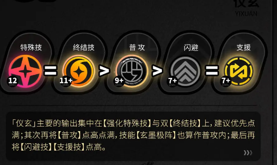 ②术法值满后,释放【终结技:符法千重】获得玄墨值。持有玄墨值时,可释放【普通攻击:玄墨极阵】回复闪能,同时仪玄可以站场继续攻击积攒喧响值。