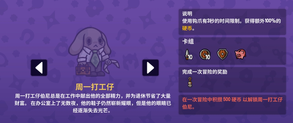 解锁条件:在一次冒险中积攒 500 硬币 以解锁周一打工仔伯尼。