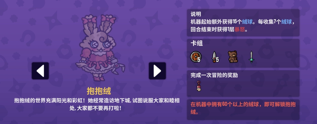 能力:机器起始额外获得15个绒球。每收集7个绒球,回合结束时获得1层暴怒。