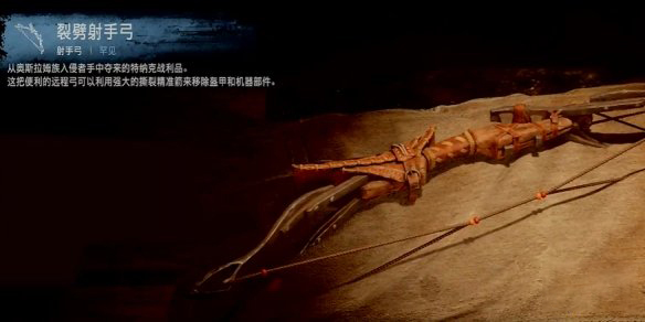 初始的猎手弓再好到了后期都会完蛋,裂劈射手弓就是可以替换的最佳选择。这把武器也是免费的,在完成第八个主线任务破碎天空后自动获得。