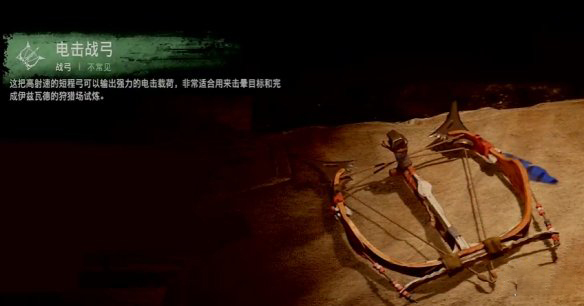 这是一把不可多得的免费好用武器,而且解锁的过程非常简单。前往狩猎训练场丹特与狩猎场看守人对话两次,他就会送你一把电击战弓。