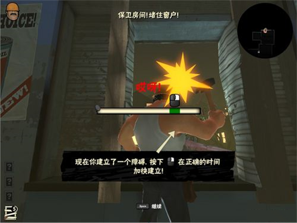 一开始操纵杰克大叔,要迅速找到钥匙之后去楼上开门找到麦克,搜索物品找到电视天线,下楼把天线装到电视机上,丧尸们喜欢看电视,这一关可以得到新的窗口修补技术,三个人物都可以使用