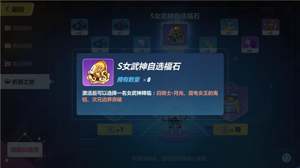 ★目前游戏内舰长累计购买2000水晶,可以在福利中获得A级女武神 今样、真炎、银狼三选一;而通过祈愿之池,可以通过6000水晶必定获得S级女武神 月光、次元、鬼铠三选一。