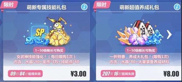 【第一次升级】舰长的等级在游戏内非常重要!这决定了女武神的等级上限,影响到装备负重,技能解锁。并且,随着等级上升,游戏内的众多玩法才逐步解锁。平时,只要舰长积极通关关卡,完成每日使命,师徒任务等,都可以获得经验哦。一定要推荐给舰长的就是经验芯片啦!使用芯片后再过关,可以获得双倍通关经验,升级速度double,前期神器不容错过!★1-50级的舰长,可以在商店中购买【萌新专属升级礼包】(每日可购买一次),仅1元。使用经验芯片,可以大幅提升舰长的升级速度哦!