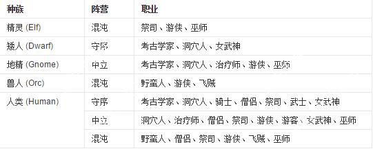 1.玩家需要选择自己所扮演的角色并指定性别、种族、职业和阵营,或者选择让系统随机产生一个角色。玩家可以扮演如矮人、精灵、兽人等魔幻种族,还有经典奇幻角色(职业),比如骑士,野蛮人,巫师,游侠,神官,僧侣和武士,也可以选择一些比较少见的角色,诸如考古学家、游客和洞穴人。阵营包括守序(lawful)、中立(neutral)或混沌(chaotic)。玩家的角色和阵营决定了其在游戏中需要侍奉的神灵。一些种族有限定的阵营和职业,如下: