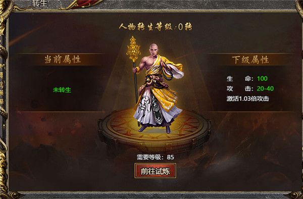 2、人物转生等级起始为0转,玩家需要通过转生试炼,来提升自身的转生等级。转生试炼包括有筑基、化神、飞升3个环节。