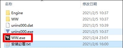 2、解压完成后,双击“WW.exe”也就是图中所示的图示,进入游戏!