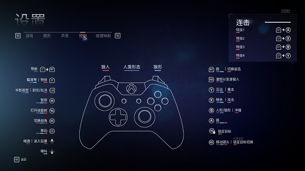 ④控制:则是针对手柄进行的按键功能,需要玩家注意的是,玩家共有三种形态,分别是狼人、人类形态,狼形,不同的形态对于操作的按键也是不同的,请仔细阅读。