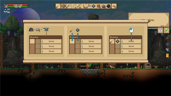 物品栏:物品栏分为了背包、武器、半成品、家具、材料、食物、魔法、符文。
