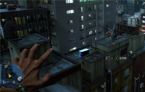 2、手柄:【RT键】瞄准楼房的边缘,出现天狗虚影后按【A键】起跳。