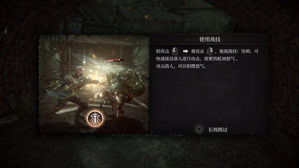 使用战技:按下【轻攻击→重攻击】或【重攻击→轻攻击】施展战技,需要消耗怒气。攻击敌人,可以积攒怒气。在天赋菜单,可查看战技详情。