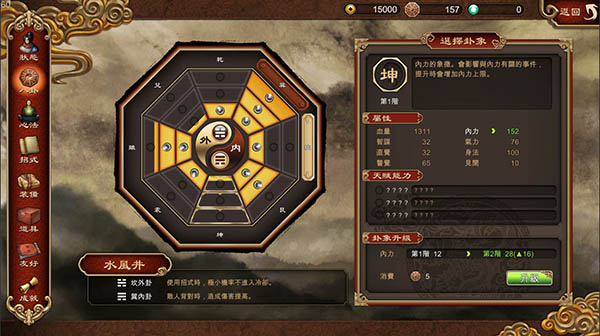 八卦由最基本的乾、巽、坎、艮、坤、震、离、兑构成,每个卦象都代表着人物不同的天赋与能力,不同的八卦选择不仅是能力的体现,更主宰了玩家的命运,你的每一次抉择都将带你进入不同的路线!