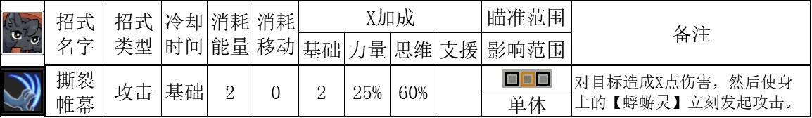 3、维丽嘉的主输出技能,撕裂帷幕。除了本身的高思维加成外,还有个特性,作为单体攻击,它可以立刻触发针对敌方单体的蜉蝣灵打击。自身作为基础技能,在行动力充沛的情况下,可以使用两次。加上回合结束,即总计触发3次的蜉蝣灵总攻。搭配鞭笞灵,最低可叠加9层,45%的间接伤害增幅。