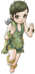 翘的短发,可爱的脸孔,头上长有两只短角,背上的龙翅只能飞行一小段距离,个性莽撞而冲动,对于青龙圣者有着莫名崇拜,常因沉不住气而搞砸许多事,不过还是很受族人的喜爱,单纯的个性让她丝毫不会烦恼任何事太久。