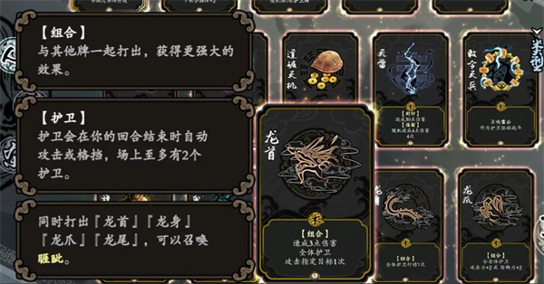 5、除此之外,“护卫”和“组合”也是《兰若异谭》里值得一提的两个机制。类似于宠物的“护卫”,往往能成为一套牌的构筑核心,只要打出这张牌召唤出它,就能一直站在场上积累BUFF。