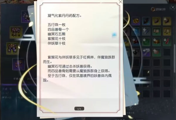 5、如果是想要突破结丹的话,首先也是要先找到对应的任务领取任务道具,他会要求玩家制作一个丹药,这里会提供一个丹方,里面有制作材料的来源及其详细的描述,收集完材料之后就炼制了,成功练成就可以直接使用它了,此时就会开始突破。