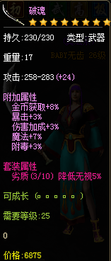 25级破魂(三职业):尸王标兵爆出(将军殿怪较多,适合刷),如果刷出可以成长的可以用很久用到76级换武器都行