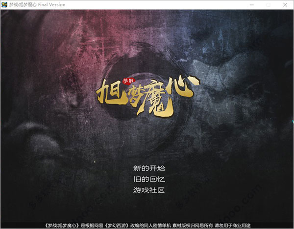 有一段剧情会黑屏,其实是晚上画面调的比较暗,仔细看或者调显示器屏幕亮度可看到。难度是几十个人一起花了很长时间调的,对于仔细爱琢磨的朋友,应该远远算不上难,如果觉得难可以看看攻略。终版总体上算是强度很低了。如果进游戏灰屏,应该是解压或者下载时丢了文件。一梦十年,入梦三年。当初那些少年风华正茂,不断追寻自己的英雄梦。如今少年已经成家立业,可梦还在继续,追梦的人一直都在。梦战旭梦魔心最终版安装说明
