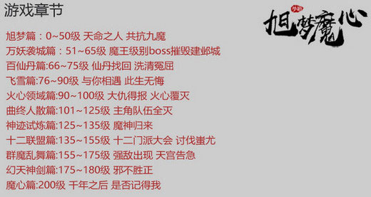 旭梦篇:1-50级;天命之人,共抗九魔。万妖袭城篇:51-65级;魔王级别BOSS摧毁建邺城。百仙丹篇:66-75级;仙丹找回,洗清冤屈。飞雪篇:76-90级;与你相遇,此生无悔。火心领域篇:90-100级;大仇得报,火心覆灭。曲终人散篇:101-125级;主角队伍全灭。神迹试炼篇:125-135级;魔神归来。十二联盟篇:135-155级;十二门派大会,讨伐蚩尤。群魔乱舞篇:155-175级;强敌出现,天宫告急。幻天神剑篇:175-180级;邪不胜正。魔心篇:200级;千年之后,是否记得我?