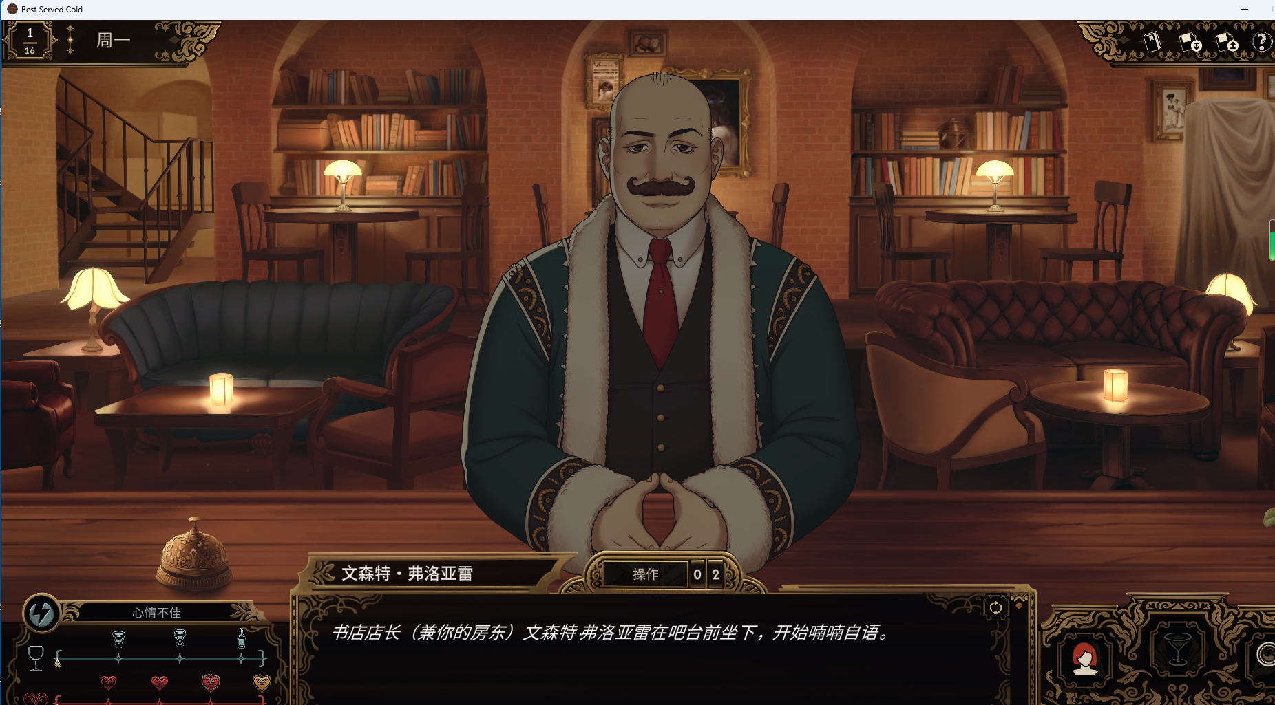 十年不晚电脑版(Best Served Cold)是一款叙事驱动类悬疑推理游戏,它以架空历史中禁酒令时期的欧洲城市“布科维”为背景,玩家将扮演地下酒吧“睡帽”的经营者,通过白天调制鸡尾酒与顾客互动,获取线索;夜晚在公寓的证据板上梳理案件细节,揭开连环谋杀案的真相。十年不晚电脑版游戏还巧妙融合调酒模拟与侦探推理,玩家需根据顾客性格调制专属饮品(如镇静焦虑者的“月光摇篮”或刺激多疑者的“烈焰红唇”),利用“情绪图谱”系统影响其心理状态,从而解锁关键信息。