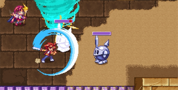 2、在冒险环节中,玩家操作主角“勇人”,通过简单的操作施展出多样的剑技,翻滚回避敌人攻击,并在翻滚中反击。