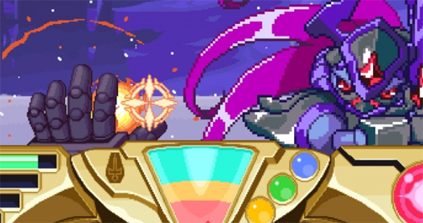 3、在头目战环节中,玩家操作精灵机弗烈利特,以第一人称视角进行仿3D射击动作玩法,使用魔法弹狙击敌人,并用剑对付逼近的敌人。