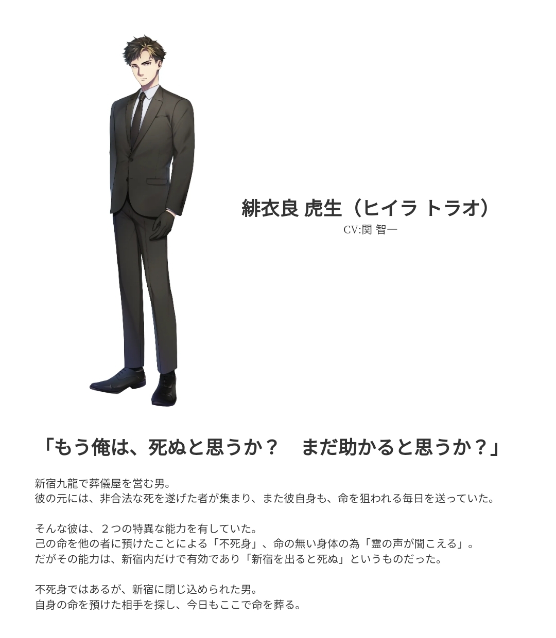 新宿葬命中文版是一款由片冈智担纲剧本的视觉小说游戏。故事背景设定在架空的“罪恶都市”新宿九龙中,玩家将通过“绯衣良虎生”的视角展开一系列事件,探索现代社会下的“生命的意义”。游戏采用的叙事方式是章节体+POV视角,在每个小节,我们会涉及到角色之间的视角切换,因此游戏中的“我”并不全是主角虎生,而是玩家自己选择的角色!玩法上,玩家将一边用自身灵力帮助国安局调查“自杀骗保”犯罪的同时,一边和幽灵女主凛音共同探寻自己无法离开新宿的秘密,并逐渐揭开自身“寄放生命而获得不死之身”的真相,同时与“青梅竹马三人组”开展故事剧情!