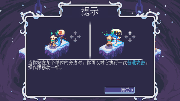 1、永不言弃的玩法机制有点像是在《特鲁尼克大冒险》、《风来的西林》这类不思议迷宫定位作品基础上剔除了地牢迷宫要素的一款“棋类”游戏,且等距的操作形式和视角风格也都原封不动,玩家在爬塔过程中主要做的就是在不死的前提下清理当前关卡场景中的所有的小怪敌人,一旦死掉就只能重新从第一层开始爬塔了,每一回合玩家可以选择单格移动或双格冲刺(冲刺方向路径需要畅通),横竖向有相邻敌人时可以输出攻击,玩家每行动一次(包括移动和攻击),场景内的所有的小怪敌人也会跟进同步行动一次(准确来说是“一动一静”)。