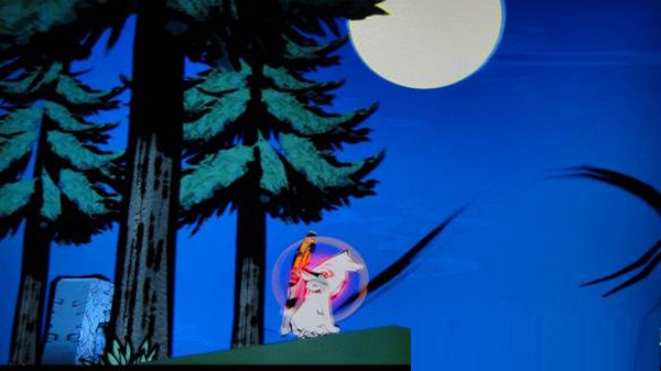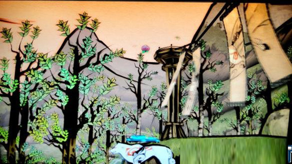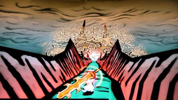 在有树桩的房间的天空画出太阳,使上面蘑菇长大。遇到有鬼眼的门,从旁边跳到底层与答选坊对话,撞击它后它会露出弱点,这时用画笔点击弱点即可将它破坏。叼着中央平台上出现的破魔矢打开鬼门。将深处流出毒水的坛子破坏,返回最初的地点。