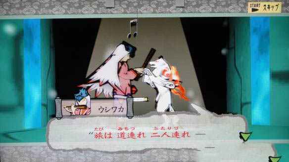 到切舌公公和婆婆的屋子上方破坏屋顶的木板,等到夜间把婆婆拖到射入的月光下,与附身到公公婆婆身上的鸟天狗发生战斗。带着麻雀小姐到屉部乡,在本部内一层右边的温泉玩一个挖地的小游戏开放温泉,之后得到笔神——濡神。把水引到竹筒内,打开旁边的门,到达山顶斩开发亮的竹节,打败义狗获得义玉。返回温泉处竹取翁会给大神一枚人鱼的古钱,可以用它在各地的泉水处进行传送,商人处以后也会出售。