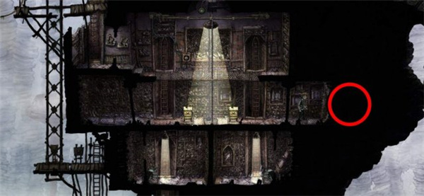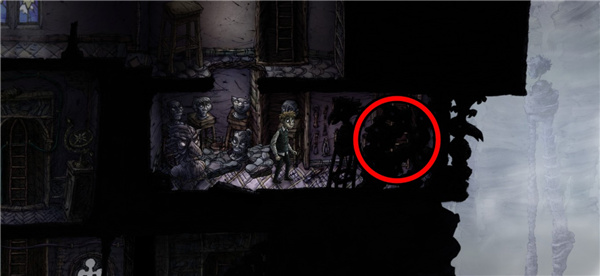 3、场景2,是第一个操作关卡,红圈这里的小怪物看住了向下的楼梯,先控制主角前往黄圈处,怪物(狗?)会追到篮圈停留,之后让主角回到上层跳到篮圈怪物的背后,进去红圈的梯子,之后一路往下进入下一关。